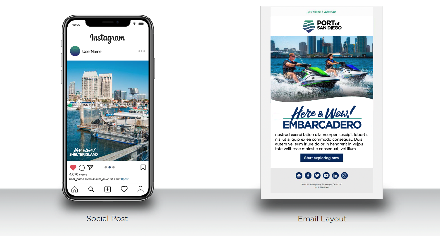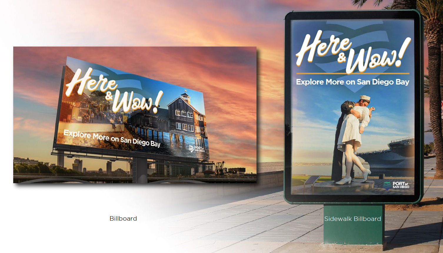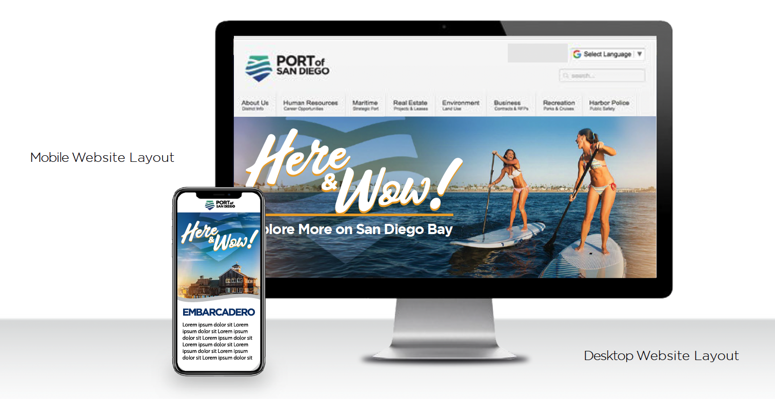 Sample applications and extensions were designed to encompass every conceivable media tactic, including print/signage, digital/web, social media, video and direct mail. Here & Wow! is active now, as the Port encourages both visitors and locals alike to “Explore More on San Diego Bay.”